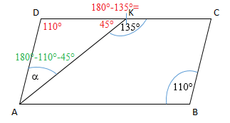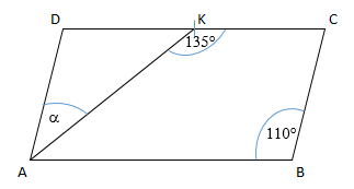 Daný je rovnobežník ABCD. Bod K je stredom CD. Vypočítajte veľkosť uhla α.
