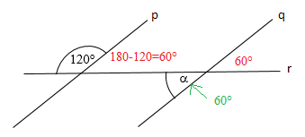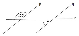 Dané sú priamky p, q, r. Priamky p, q sú rovnobežné. Aká je veľkosť uhla α?